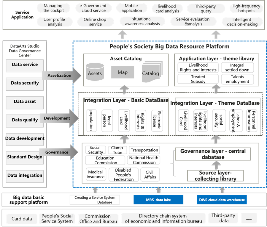 Lebih 40 peraturan pembersihan data telah diwujudkan bagi mengurus 230 juta rekod data (7.3 TB), menyepadukan data perniagaan, imej dan data bertema untuk membentuk satu “peta tunggal” data rakyat dengan 1,625 aset data. Lapan pangkalan data asas serta pelbagai pangkalan data bertema dibangunkan bagi menyokong lebih 150 aplikasi, membolehkan konsep satu orang, satu kad, satu fail, dengan lebih 800,000 perkhidmatan dan kadar pengendalian dalam talian melebihi 90%, ke arah merealisasikan masyarakat digital.